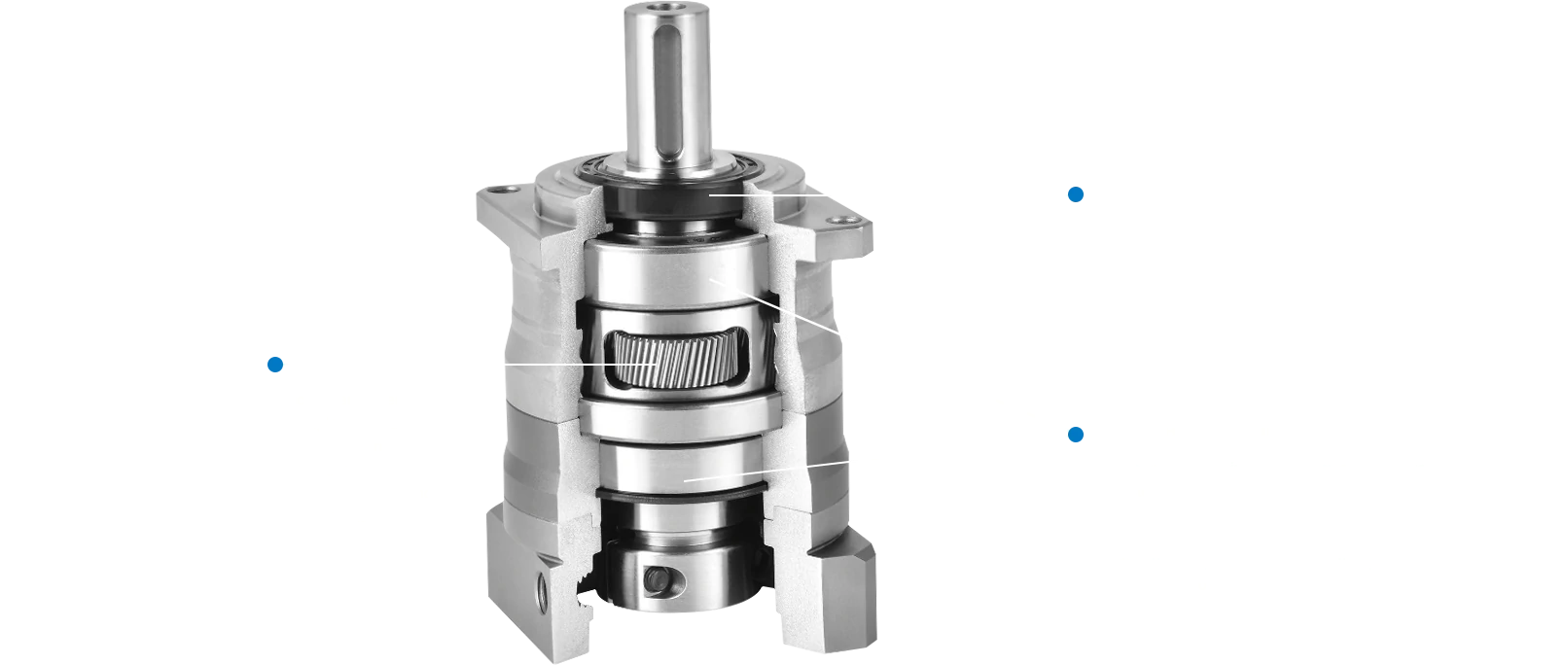 The reducer adopts an integrated structural design for the output flange and gear ring. Both the output shaft and planet carrier use a dual-support cage structure with a wide-span bearing arrangement, providing exceptionally high radial load capacity and excellent axial load capability.